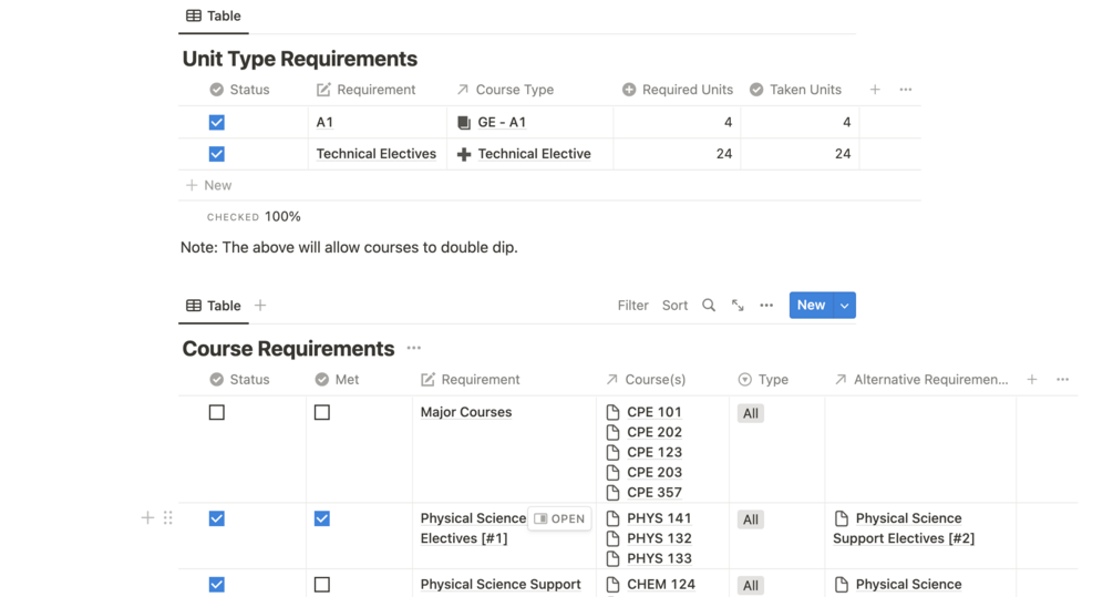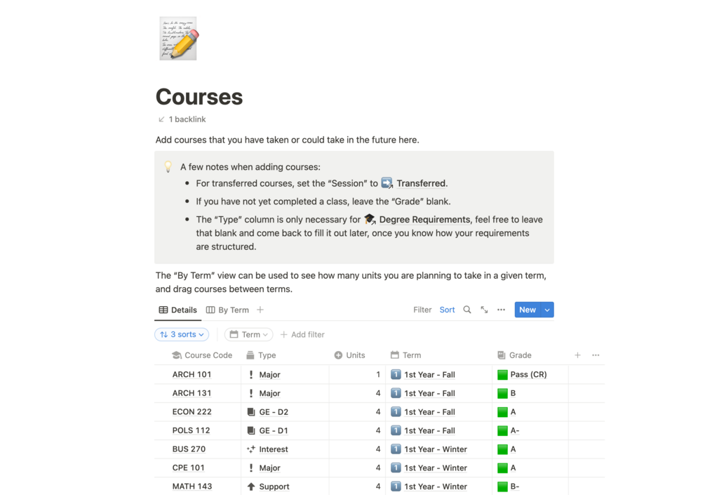 This template for Notion lets you easily plan out your courses, make sure that you will fulfill your degree requirements, and track your grades along the way!